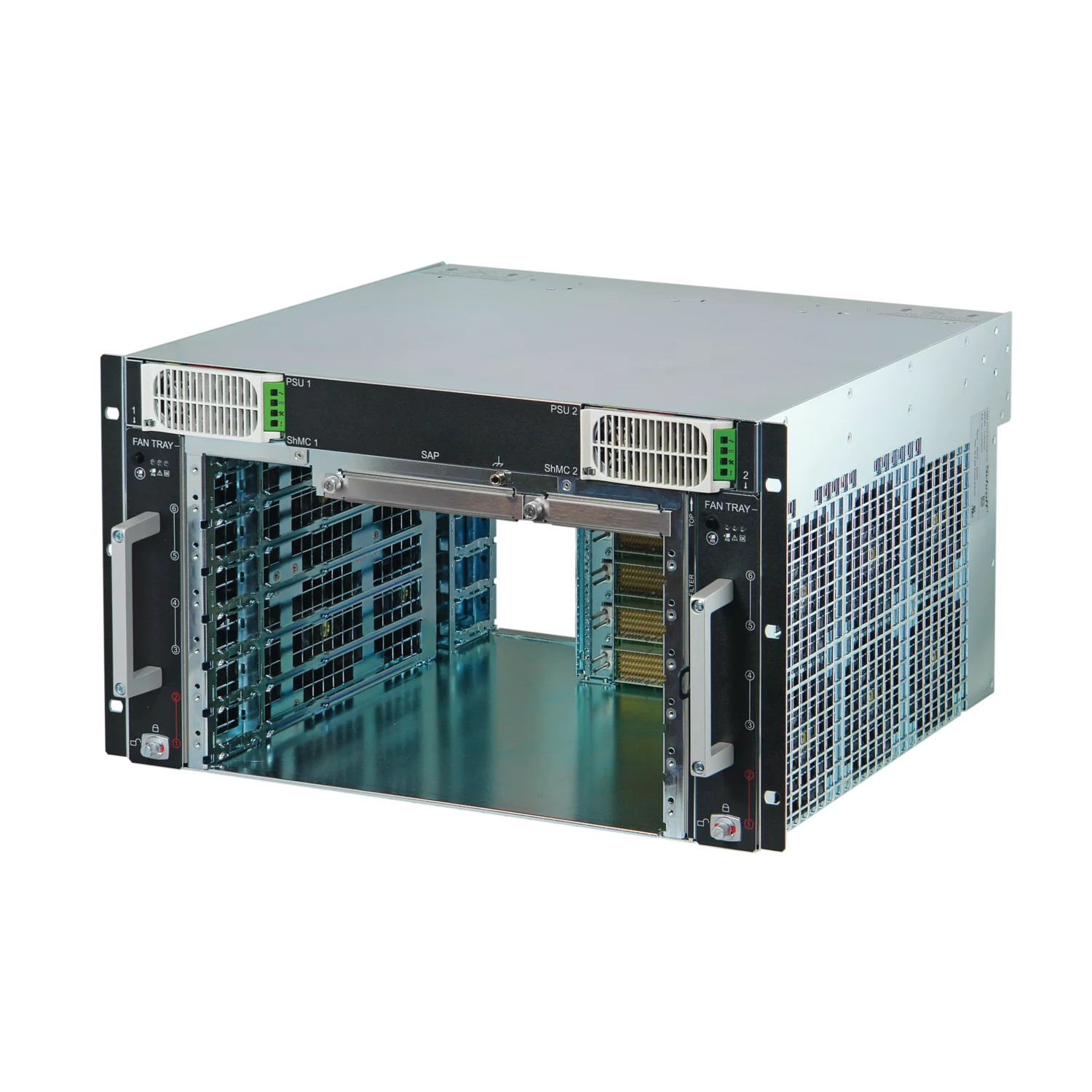 - Система подготовлена для установки одного модуля аварийной сигнализации и двух плат управления шасси SCHROFF с Pigeon Point ShMM 700