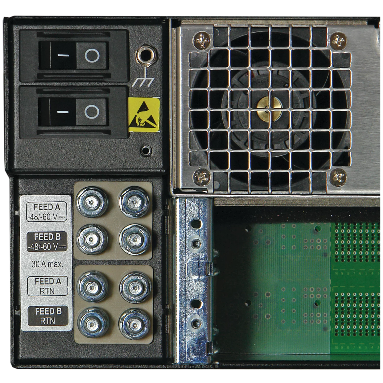 | 3 | Redundant power connection, -48 V DC/-60 V DC, at the rear, with 1 pair of power terminals (1 fuse, 30 A) each | 2 | |