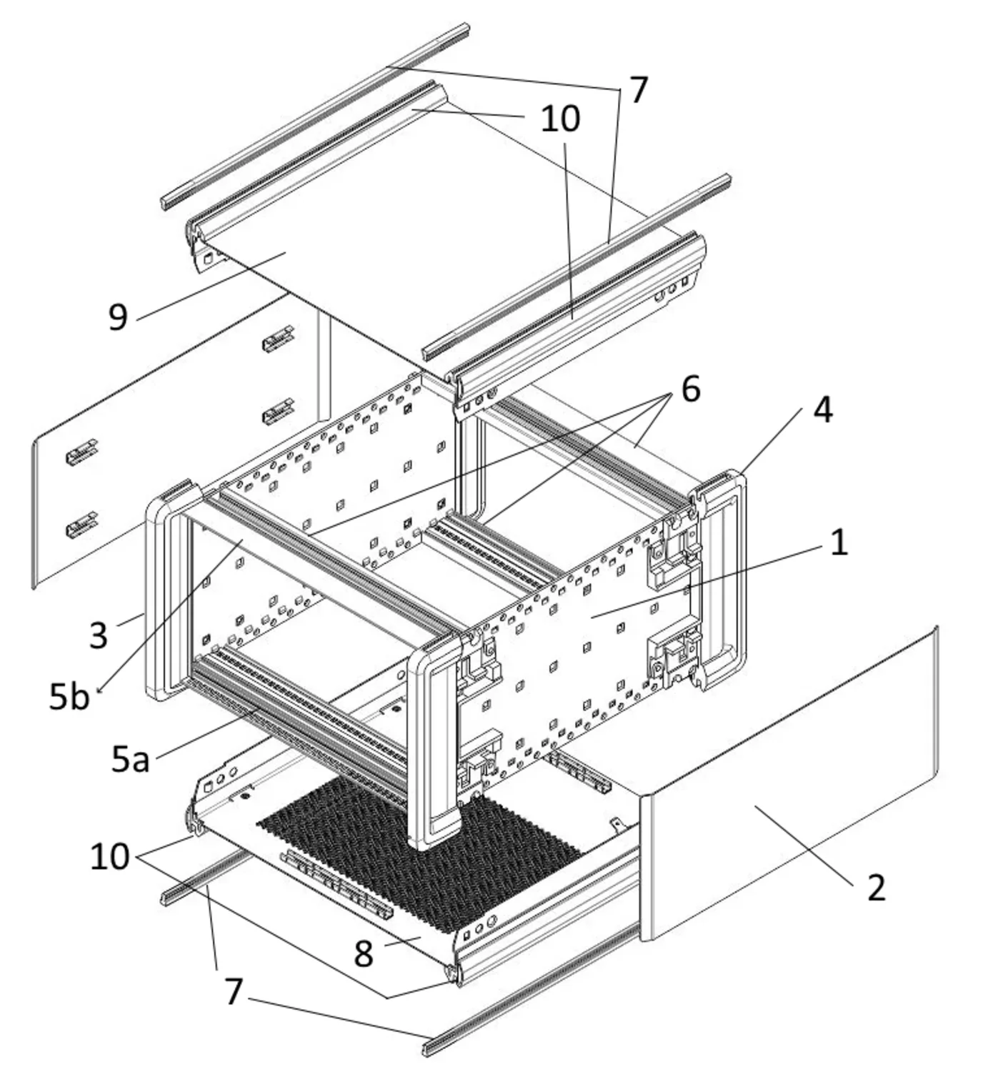 - Case for 19" components (guide rails) or proprietary components (mounting plate).