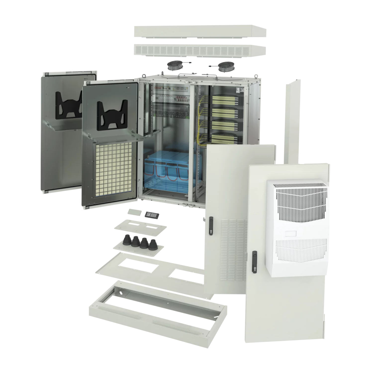 | 3 | Double skin double door, Al raw inside; St RAL 7035 outside; 3-point lock, swivel handle with DIN profile half cylinder, door opening angle 135 °, door lock at 120 °; 2 equal width door leaves, door hinges left + right | 1 | |