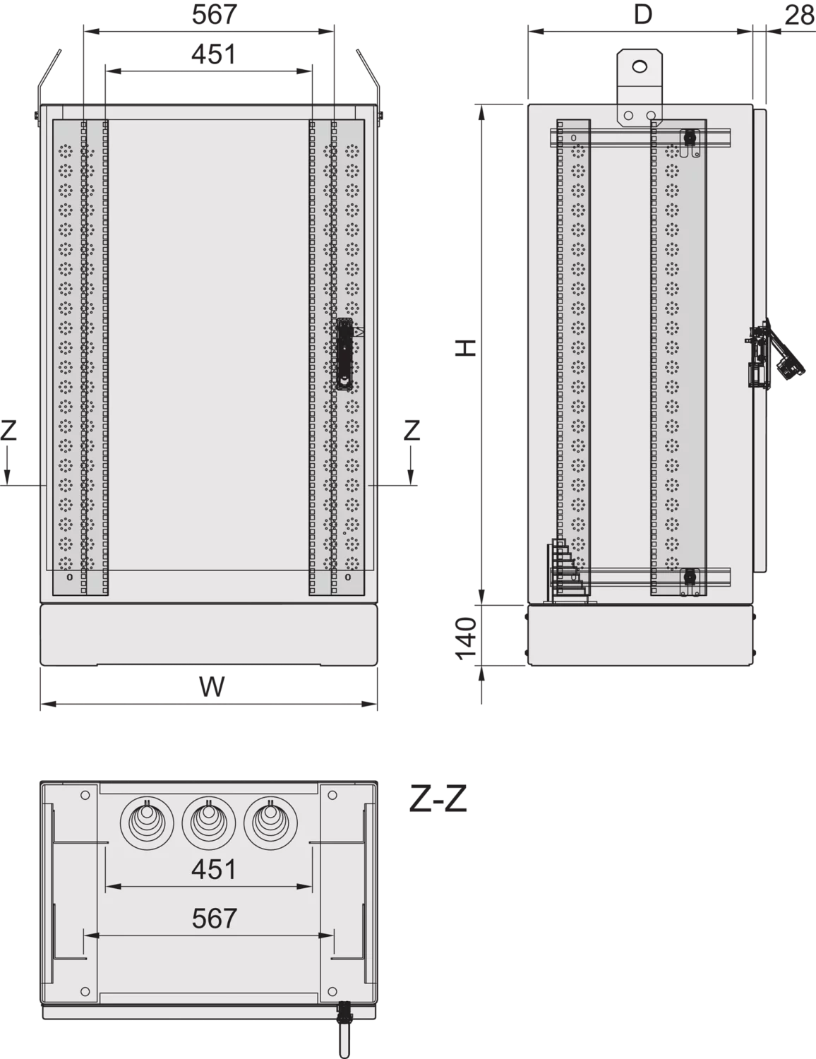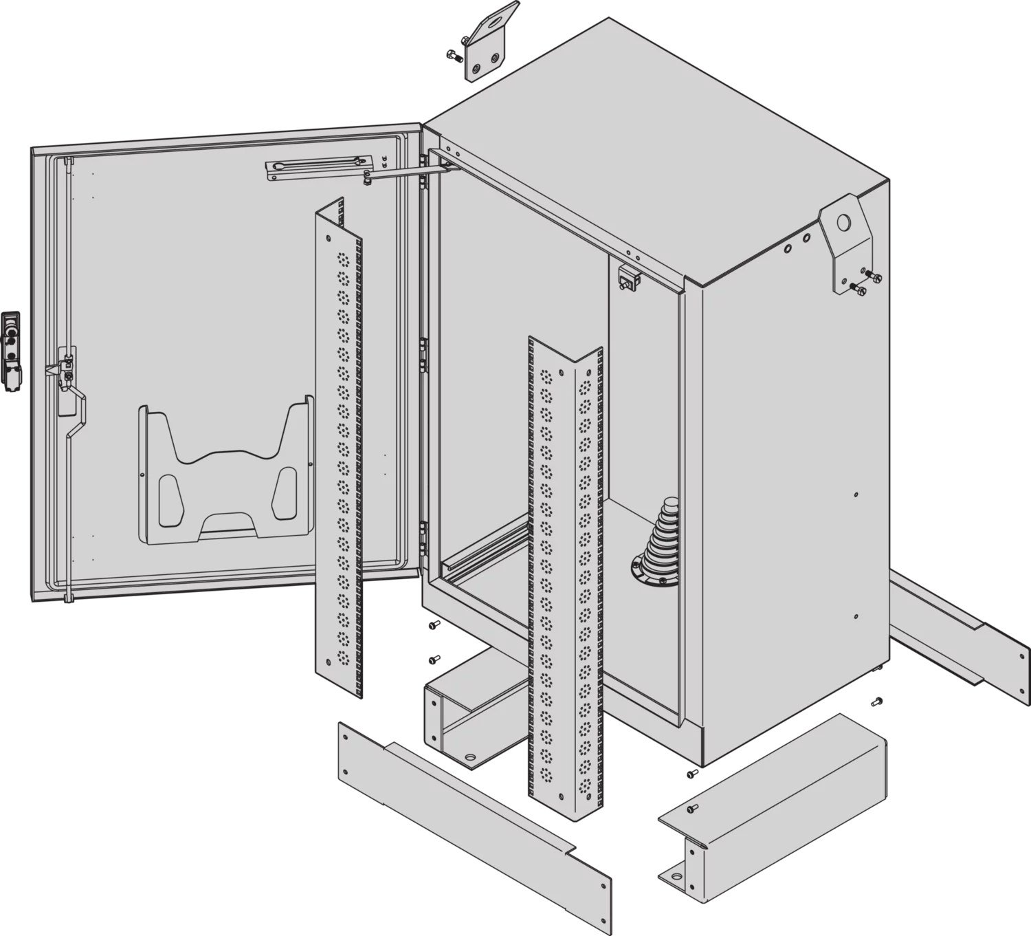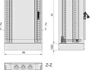 | 2 | Door, Al, 2.5 mm, RAL 7035, 3-point locking, lever handle with DIN profile half cylinder (1242E), door opening angle 135°, door retainer at 110°, door hinged on left hand side; electrical door switch | 1 | |