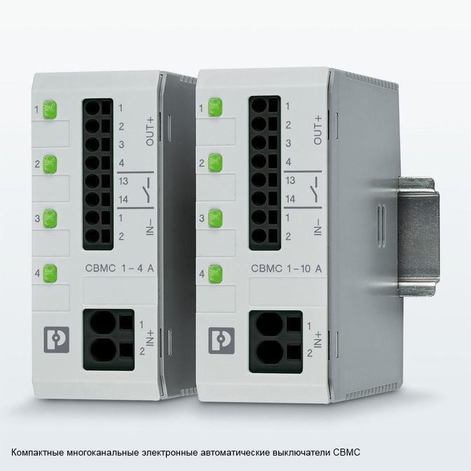 | 356526 | 2908716 | Электронный защитный выключатель - CBMC E4 24DC/1-10A NO-C | Многоканальный электронный автоматический выключатель, в комплекте, для защиты четырех потребителей сети 24 В пост. тока от перегрузки или короткого замыкания. С электронной блокировкой настроенных номинальных токов. Для установки на DIN-рейки. |