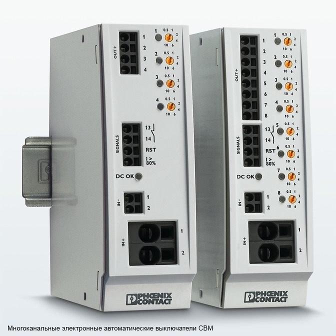 | 356530 | 2905744 | Электронный защитный выключатель - CBM E8 24DC/0.5-10A NO-R | Многоканальный электронный автоматический выключатель с активным ограничением тока для защиты восьми потребителей сети 24 В пост. тока в случае перегрузки или короткого замыкания. С функцией поддержания номинального тока и электронной фиксацией настроенных номинальных токов. Для установки на несущих DIN-рейках. |