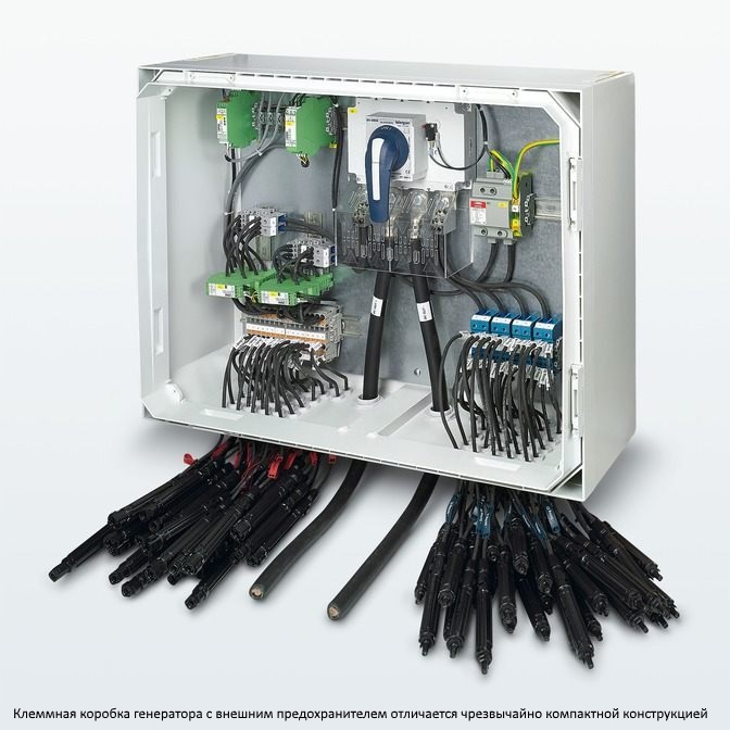 | 356296 | 2404297 | Блок коммутационных приборов - SOL-SC-2ST-0-DC-1MPPT-1101 | Распределительный щит генератора для ФГ-установок до 1000 В DC для подсоединения 1х 2 цепей. С защитой от перенапряжений, разделительным выключателем DC и разъемом DC SUNCLIX для стороны входа и выхода. |