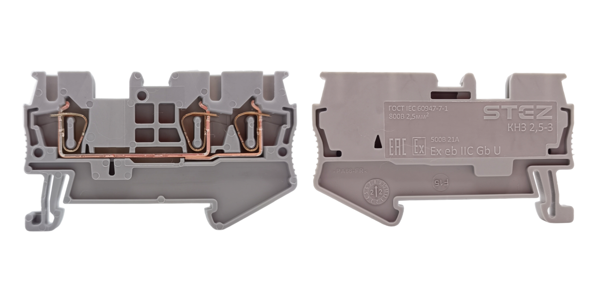 | 10000090 | KHЗ 4-3 | Проходные клеммы, количество точек подсоединения: 3, номинальное напряжение: 800 В, номинальный ток: 32 A, тип подключения: пружинный зажим, 1 уровень, расчетное сечение: 4 мм², сечение: 0,2 мм² - 6 мм², тип монтажа: РМ-35/7,5, РМ-35/15, цвет: серый |