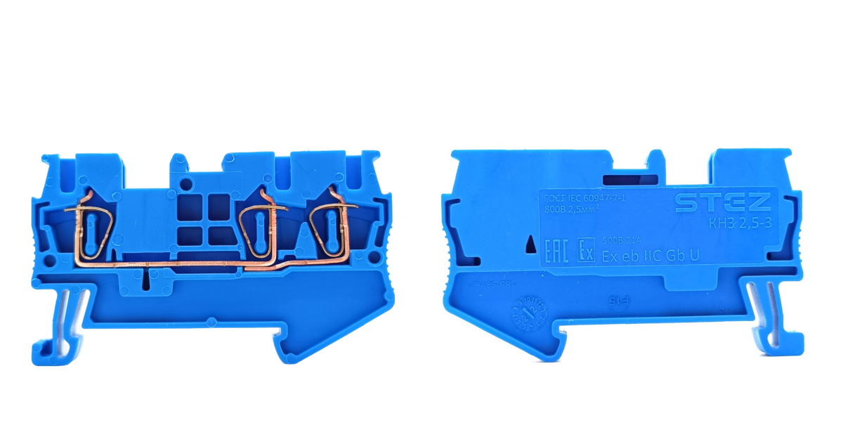 | 10000111 | KHЗ 10-3 -С | Клемма пружинная, проходная, 2 контакта, синяя, сечение 10мм2, 800В, 65А |